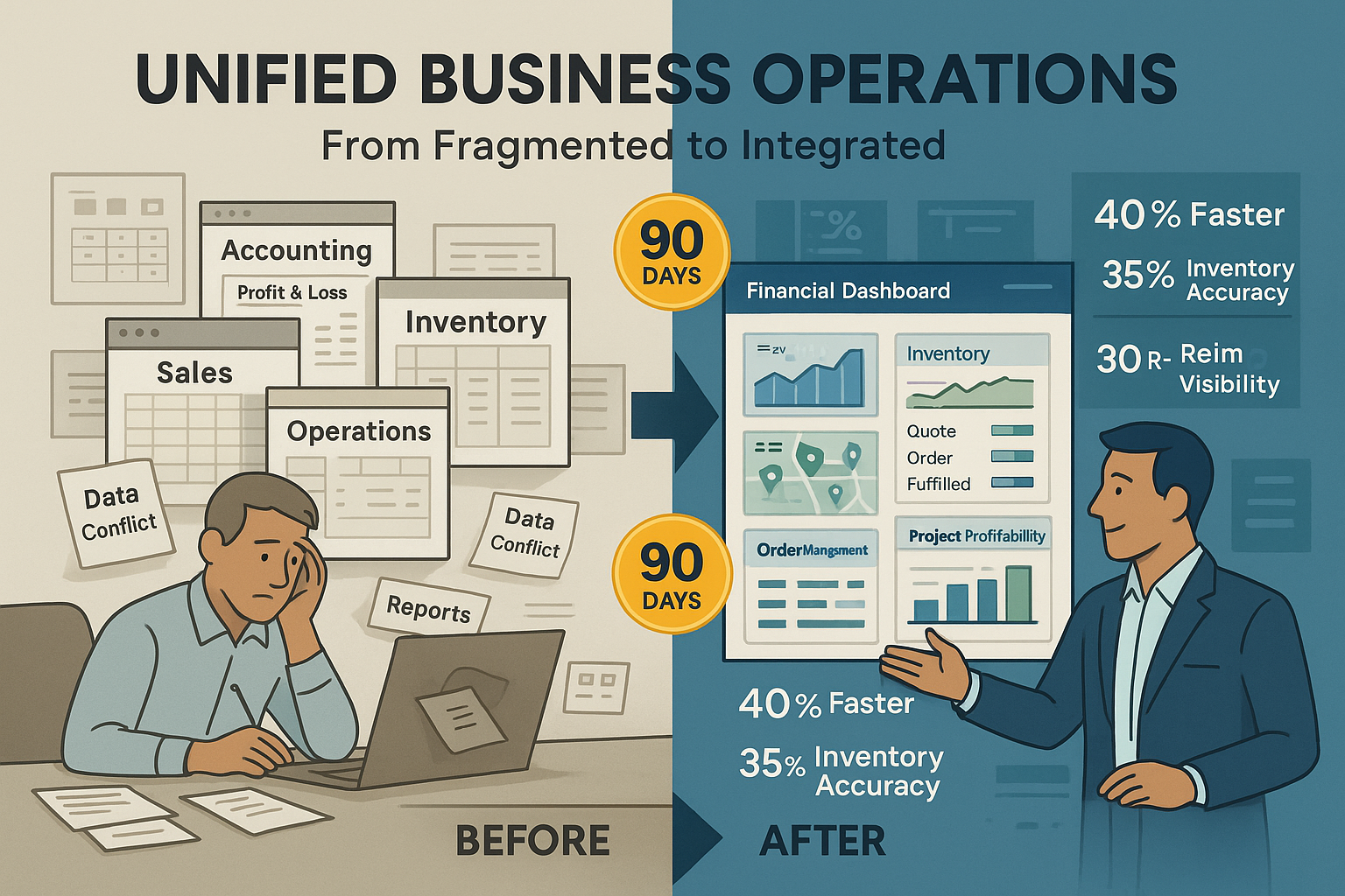 Our implementation methodology focuses on rapid value realization—automating financial consolidations, streamlining inventory workflows, and establishing real-time reporting capabilities that transform decision-making from reactive to predictive. Organizations running our implementations achieve 40-50% faster financial close cycles, 60-70% reduction in manual journal entries, and real-time visibility replacing week-old spreadsheet reports.